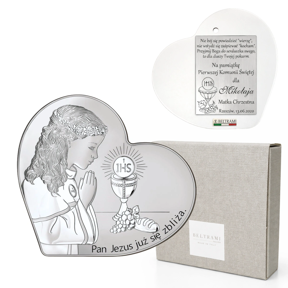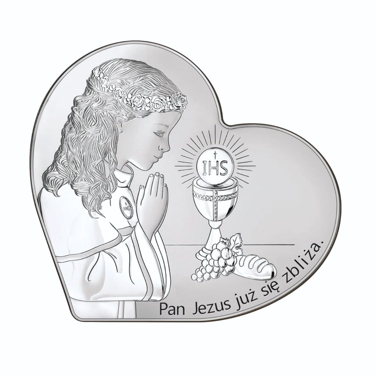 Srebrny obrazek, w kształcie serca, przedstawiający dziewczynkę przystępującą do Pierwszej Komunii Świętej z napisem "Pamiątka już się zbliża".
