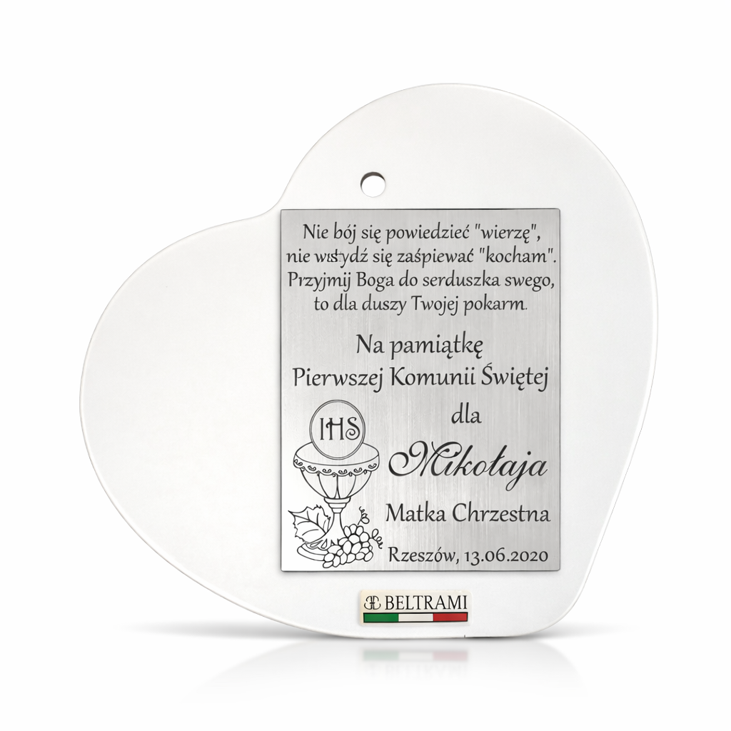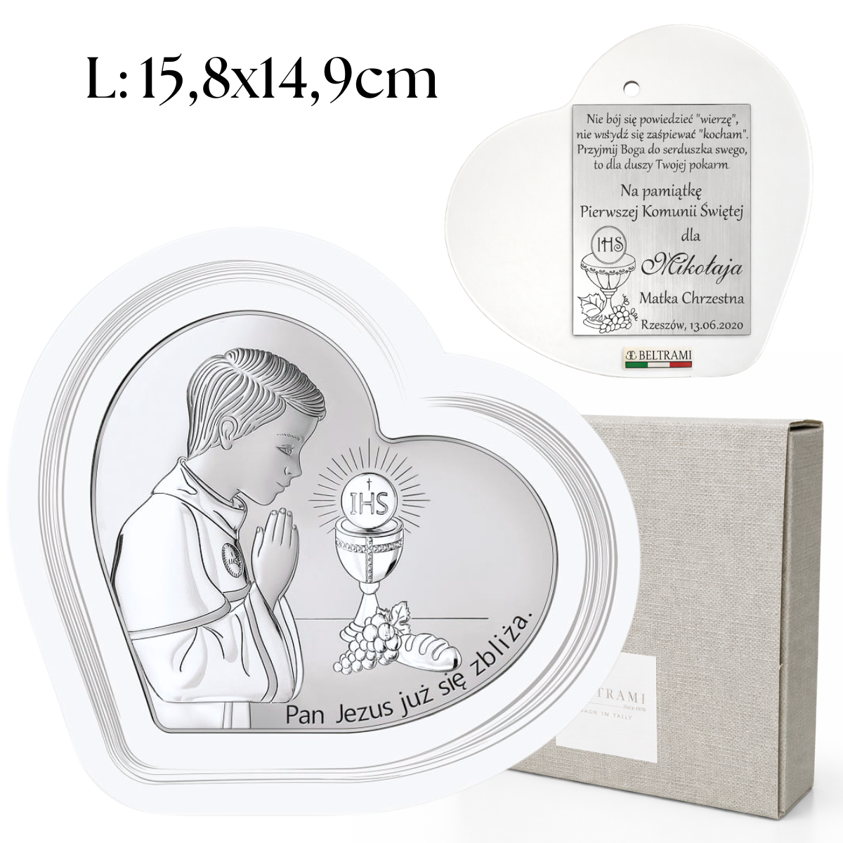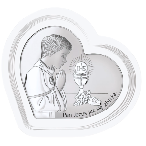 Srebrny obrazek w kształcie serca z białą ramką, przedstawiający chłopca przystępującego do Pierwszej Komunii Świętej z napisem "Pamiątka już się zbliża".