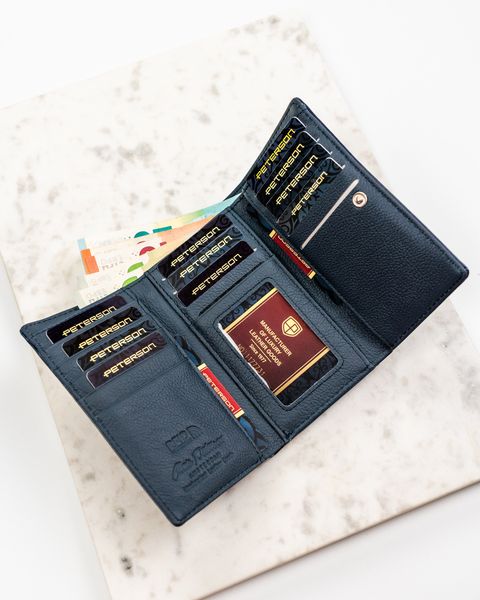 Elegancki i funkcjonalny portfel damski od Peterson to idealne połączenie stylu i praktyczności. Wykonany z wysokiej jakości skóry naturalnej, zachwyca głębokim, granatowym kolorem oraz starannym wykończeniem, które podkreśla jego luksusowy charakter.