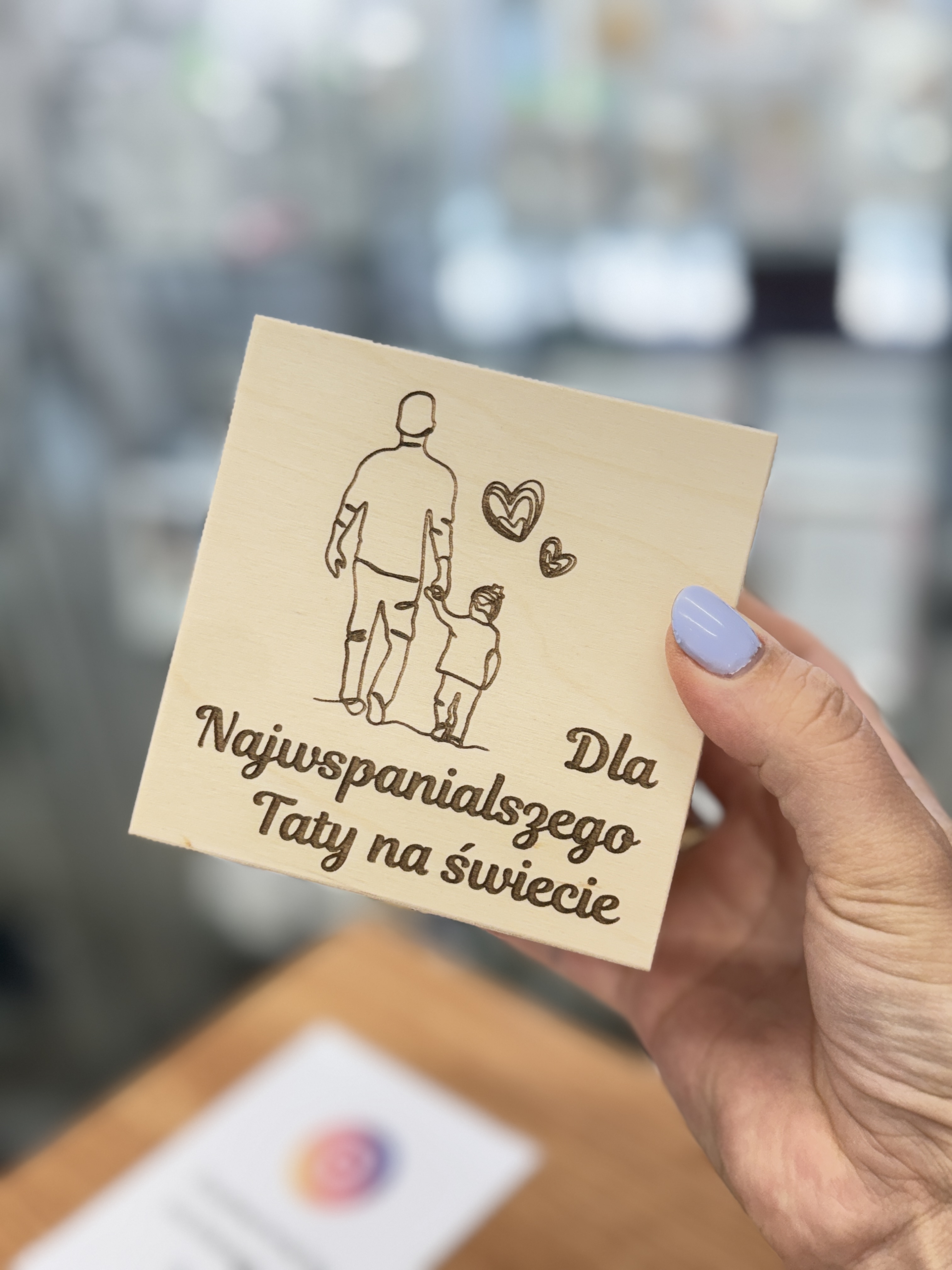 Wygrawerowany tekst znajdować się będzie na wieczku pudełka oraz osobno na drewnianej sklejce, zostanie wypalony laserem diodowym.