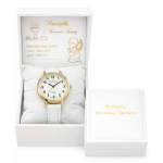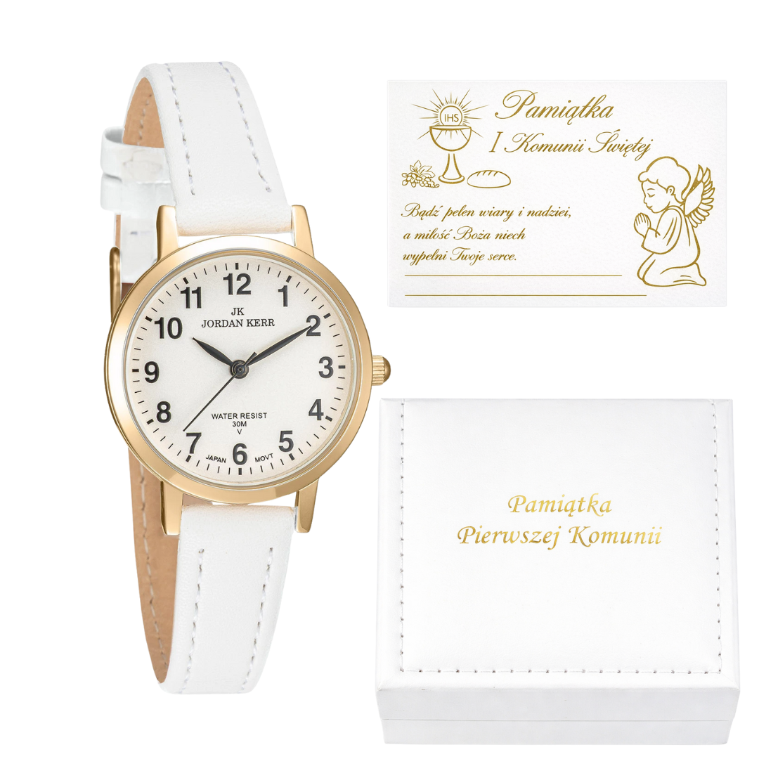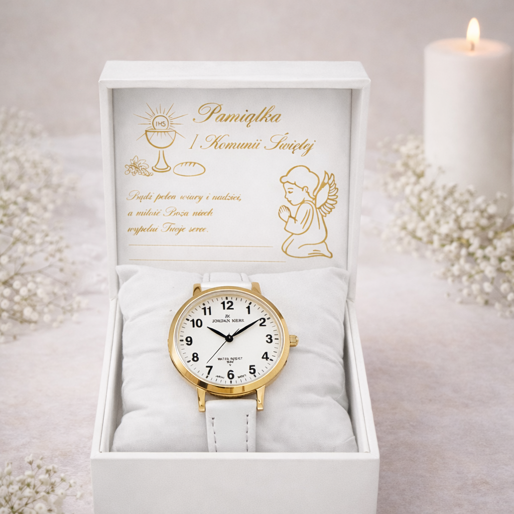 Zegarek posiada czytelną tarczę z cyframi arabskimi oraz elegancką złotą kopertę, dzięki czemu doskonale sprawdzi się zarówno na uroczystość komunijną, jak i do codziennego noszenia. Klasyczne połączenie bieli i złota nadaje mu subtelny, uniwersalny charakter odpowiedni dla dziecka.