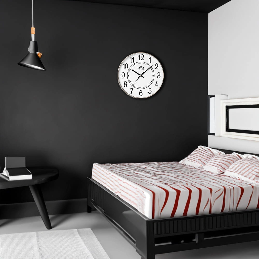 Klasyczny, duży zegar ścienny w plastikowej obudowie.