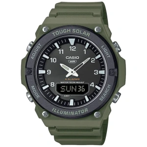 Sportowy zegarek Casio w kolorze oliwkowej zieleni, łączący klasyczny analogowy cyferblat z cyfrowym wyświetlaczem. Wyposażony w zasilanie solarne (Tough Solar), wodoodporność do 100 m oraz funkcje takie jak alarmy, podświetlenie i datownik. Solidna koperta i wytrzymały pasek sprawiają, że świetnie sprawdzi się na co dzień i w terenie.